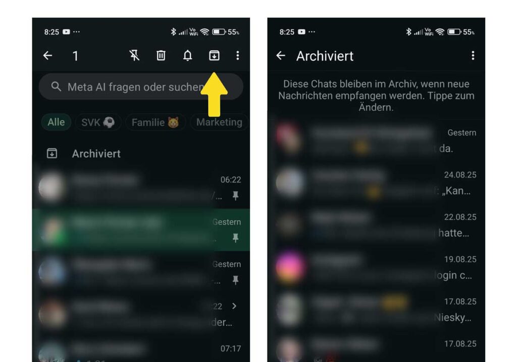 - Fertig – der Chat verschwindet aus deiner Hauptansicht und findet sich nun ganz unten im Bereich „Archiviert“.